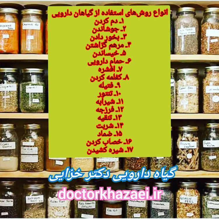 انواع روشهای استفاده از گیاهان دارویی: ۱ـ دم کردن؛ آب را به جوش آورید و به محض جوش آمدن گیاه را در آن بریزید و ۱۰ دقیقه بگذارید تا دم بکشد ۲ـ جوشاندن ؛قسمت مورد نظر گیاه را ۲۰ تا ۳۰ دقیقه بجوشانید و صاف کنید ۳ـ بخور دادن ؛گیاه را بجوشانید و پارچه روی سر خود بندازید و بخار را استنشاق کنید ۴ـ کفلمه کردن؛ گیاه را بین دو کف دست ساییدن و خوردن ۵ـ خضاب کردن؛ ضمادی که موی سر و پوست را با آن رنگ کنند و یا برای تقویت مو ببندند ۶ ـ فرزجه ؛استعمال جوشانده گیاه از طریق واژن ۷ ـ ضماد؛ گیاه جوشانده شده یا له شده را روی پوست میگذارند ۸ـ تنقیه؛ مایع به دست آمده از گیاه را در مقعد تزریق نمودن ۹ـ شیرابه؛ گیاه تازه را در هاون کوبیدن و داخل یک پارچه نخی تمیز قرار دهید و عصاره آن را درآورید ۱۰ـ خیساندن؛ گیاه را چند ساعت در مایعی سرد که معمولاً از الکل طبی ۹۰ درجه یا روغن میخیسانند ۱۱ـ شربت؛ جوشاندن قسمتی از گیاه و صاف کردن و شیرین ساختن آن ۱۲ـ شیره کشیدن؛ تخم یا گیاه را خیس کنید تا کاملاً نرم شود سپس آب را بیرون ریختند و چلاندن ۱۳ـ تنتور؛گرد گیاهی را به مدت ۲ تا ۳ روز در الکل ۹۰ درجه قرار دادن ۱۴ـ افشره ؛چکاندن عصاره گیاه با کوبیدن یا چلاندن ۱۵ـ فتیله ؛فرو بردن قسمتی از عضو گیاه در واژن یا سوراخ بینی و غیره ۱۶ـ حمام دارویی ؛جوشاندن قسمتهای مورد نظر گیاه و دراز کشیدن در وان محتوای جوشانده ۱۷ـ مرهم گذاشتن؛ گیاه را له یا رنده کنید تا خمیر گردد و در پارچهای بپیچید و اغلب به صورت گرم یا ولرم و گاهی به صورت سرد روی موضع قرار دهید. تهیه شده و انتشار از گیاه دارویی دکتر خزایی انتشار با ذکر منبع بلامانع است.