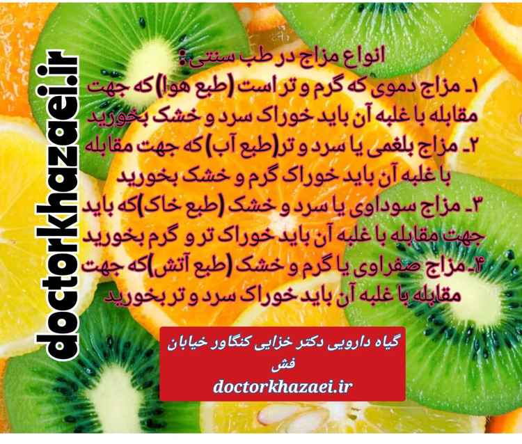 در طب سنتی چهار مزاج اصلی داریم شامل دموی، بلغمی، سوداوی و صفراوی . هر یک از مزاجها ویژگیهای شخصیتی خاصی دارند و بدن آنها برای ابتلا به برخی بیماریها مستعدتر استزاج را میتوان با گیاهان دارویی ،رژیم غذایی و ورزش تغییر داد یا تعدیل کرد. در پست های بعدی بیشتر در مورد علائم و ویژگی های این چهار مزاج بیشتر پست خواهیم گذاشت. گیاه دارویی دکتر خزایی